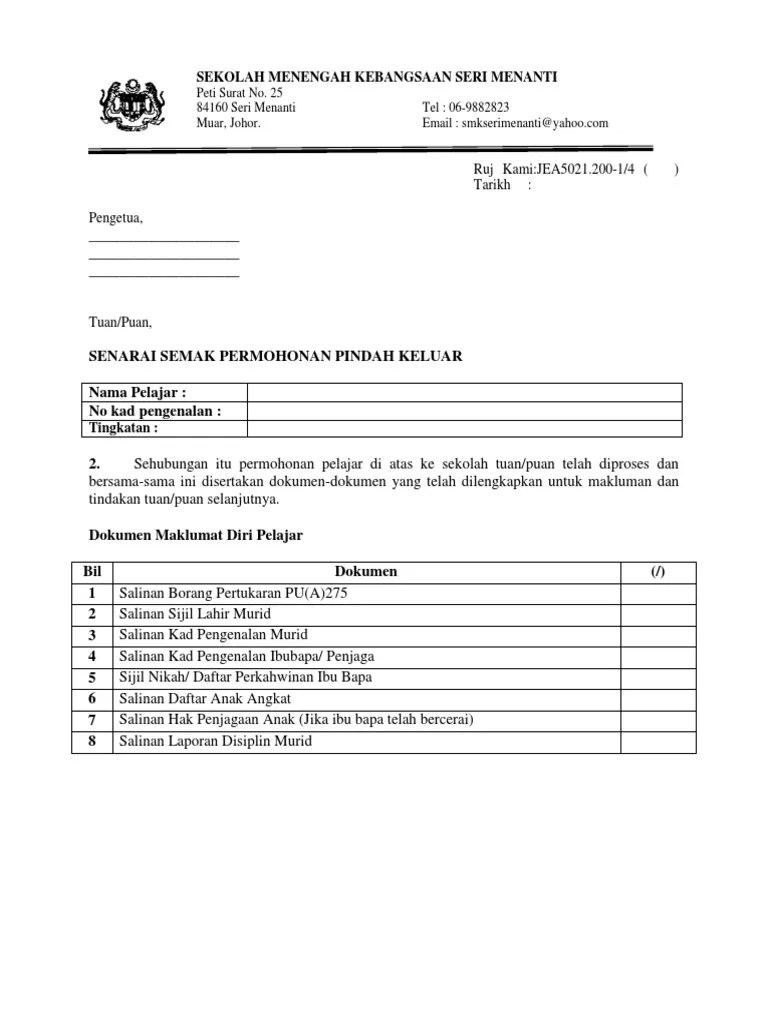 Surat Pindah Sekolah Menengah 2020 / Surat Permohonan Pertukaran Sekolah Tingkatan 6 Letter 7saudara Com. Dec 08, 2021 · menindaklanjuti surat edaran direktorat jenderal pendidikan dasar dan menengah nomor 09/d/pd/2017 tentang pemetaan mutu pendidikan tahun ajaran 2017/2018 tanggal 20 juni 2017 bahwa sekolah wajib melengkapi data instrumen pemetaan mutu sesuai kondisi sekolah yang sebenarnya. Merujuk dari surat mentri dalam negeri nomor 470/3162/sj tanggal 15 mei 2020 tentang penerapan nomor induk kependudukan … Mekanisme pengajuan npsn (nomor pokok sekolah nasional). Pusat data dan teknologi informasi nomor 3187/j1/ti/2020 perihal tata kelola pendataan pendidikan tanggal 06 juni 2020.