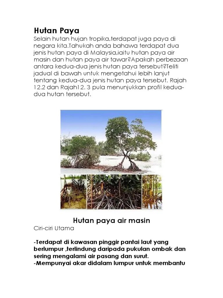 Hutan paya air masin mempunyai tumbuhan bawah yang banyak. Kepentingan hutan paya air masin terhadap ekosistem. · mencegah erosi dan abrasi pantai. Pokok bakau yang berakar banir tumbuh dikawasan yang lebih jauh dari pantai. · sebagai pencegah dan penyaring alami.